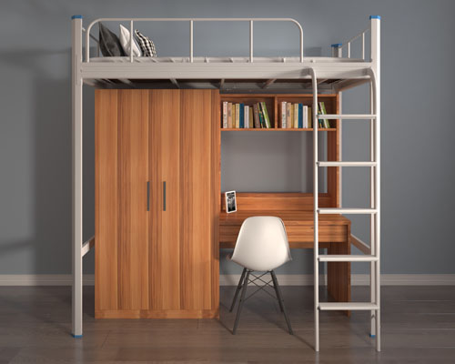 圖二中,同樣是一款鐵床與木制家具的結(jié)合,也有人叫它為鋼木結(jié)合床,實(shí)則就是將雙層鐵床的下鋪掏空,安裝了一個(gè)衣柜和書桌,雖然看上去簡(jiǎn)單,可設(shè)計(jì)出來和制造出來,卻不是那么簡(jiǎn)單的一回事了!