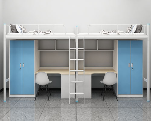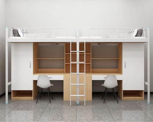5、上面的兩種學生雙層鐵床,有的是以一個鐵架子床,配置一些木制的柜子和桌子,以顯得更大體,更實用一些,同樣,也可以更找成鐵柜子;它的價格一般是300多一張,具體還得找廠家實際報價!