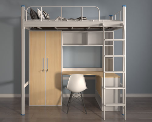 上圖中,所看到的就是一個宿舍里常用的一種鐵床,也叫做公寓床,因為外形酷似一個小公寓一般,所以得此名,它的實用性很強,上鋪可以睡人,下鋪可以給孩子們寫作業(yè),收拾衣物等功能。